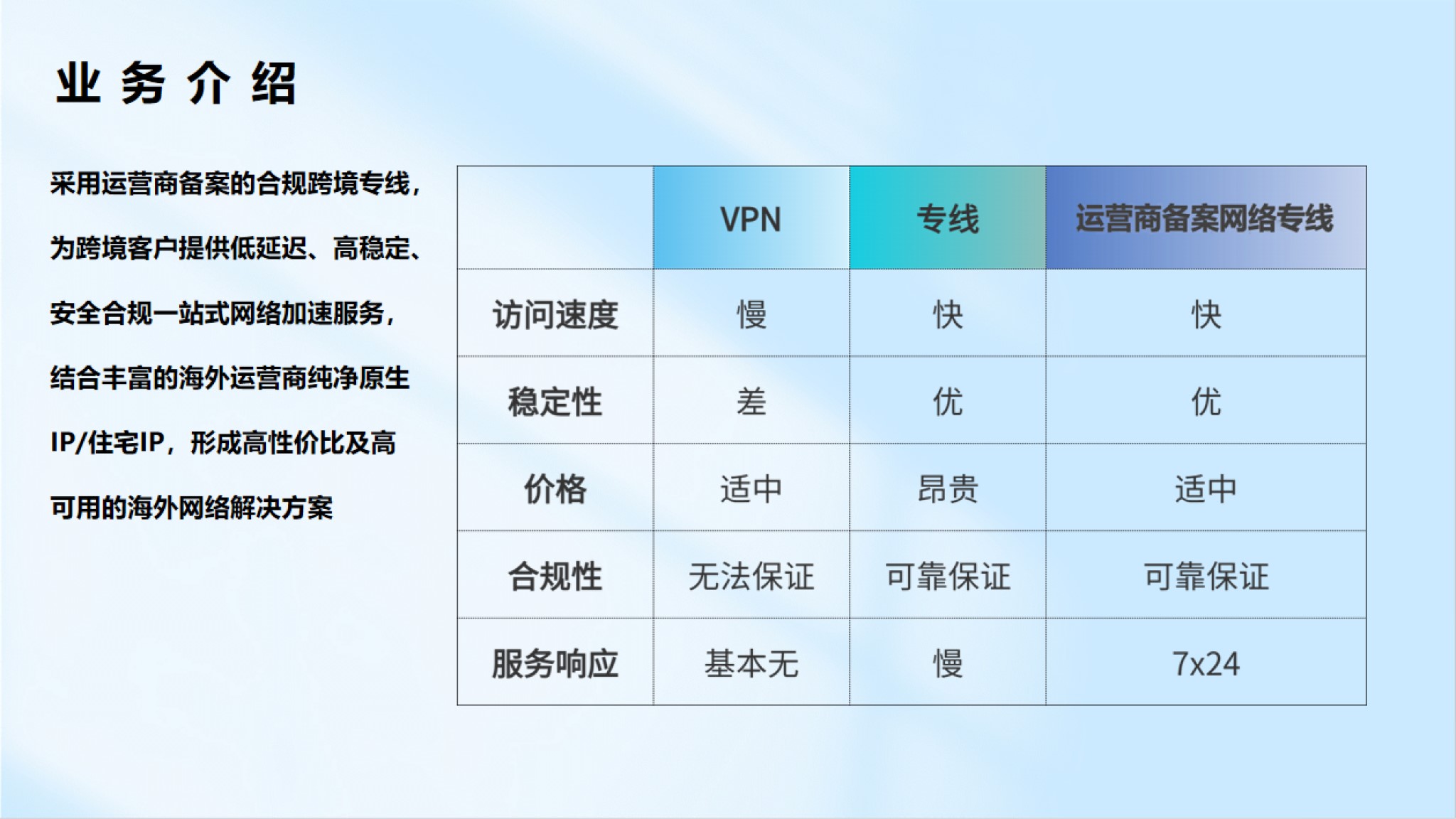遵從運營商規(guī)則,采用運營商備案網(wǎng)絡(luò)專線,結(jié)合海外運營商純凈獨享原生IP,提供低延遲、高穩(wěn)定、安全合規(guī)的海外網(wǎng)絡(luò)服務(wù)